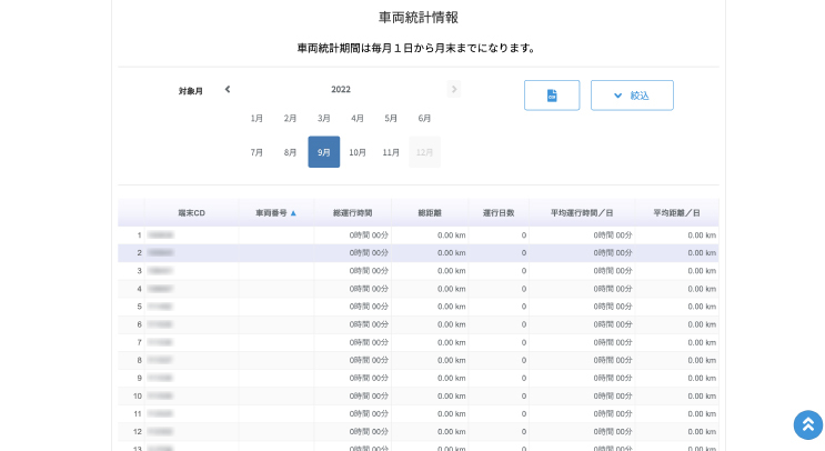 1カ月間の統計情報を確認することができます。総運行時間や総距離、運行日数などの実績や1日当たりの平均運行時間、平均距離も表示されます。