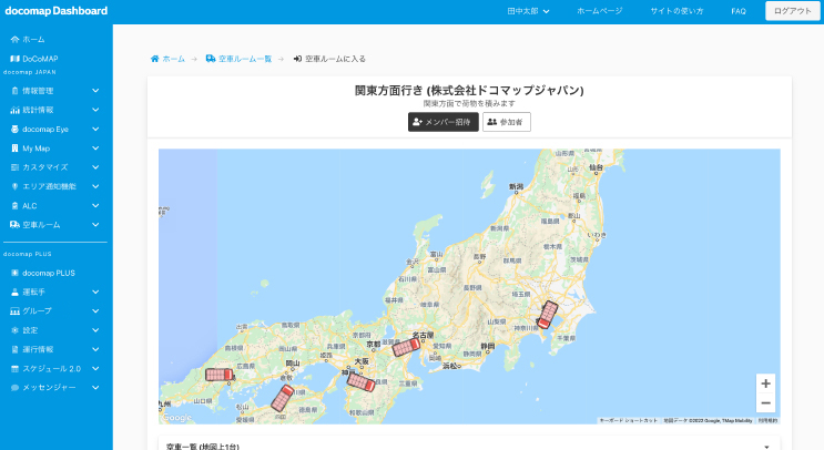 空車車両を登録し、地図上で確認することができます。また、DoCoMAP利用ユーザーであれば他企業や他支店と空車情報を共有ができ、さらに閲覧制限を設けた複数のルームを作成することもできます。