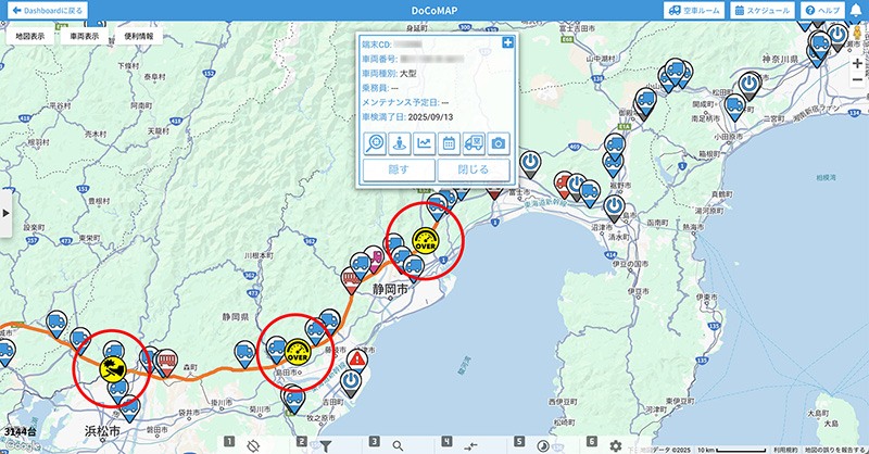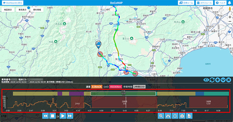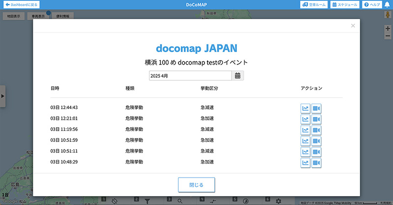 OCTLINK端末に搭載された、Gセンサーと車速パルスによる正確な速度検知で「急減速」「急加速」「急ハンドル」「速度監視」等の危険挙動閲覧が実現しました。また、カメラを連携している場合は、危険挙動の動画をDoCoMAP上でいつでもご確認いただけます。