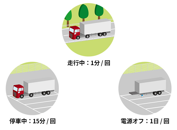 When the device is powered on, location data is acquired once per minute. When stationary, location data is acquired once every 15 minutes. When the device is not powered on, location data is acquired once per day. This allows you to effectively utilize GPS according to your needs.