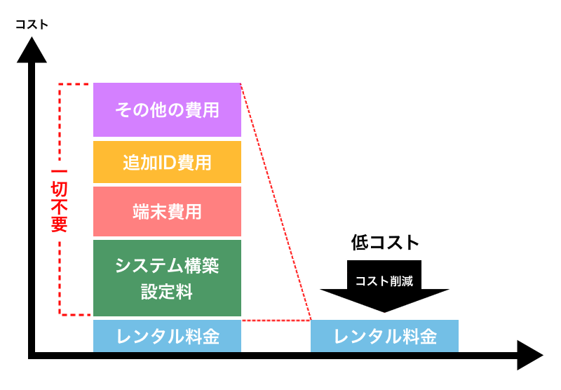 システムの構築・設定料、端末費用、追加ID費用などのその他運用上での費用負担は一切不要なので、サービス導入までは非常に手軽で低コストです。